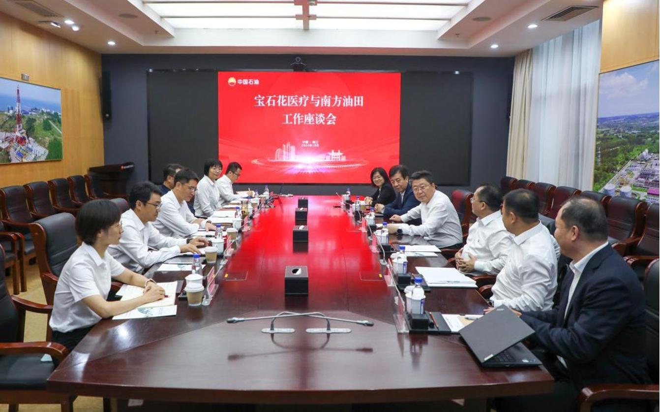 王旸详细介绍了通用技术集团医疗健康业务布局和宝石花医疗改革发展成果。他表示,宝石花医疗加入通用技术集团以来,借助央企医疗平台优势,不断加强内涵式建设,医疗服务能力进一步提升。希望在健康企业建设、康养等方面与中国石油南方石油勘探开发公司深入合作。